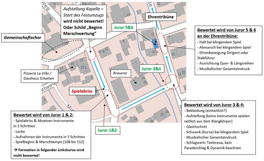 Gewertet wird an drei ausgewählten und gekennzeichneten Stellen entlang der Festzugstrecke mit jeweils zwei qualifizierten Juroren. Die Bewertungskriterien und Positionen der Juroren sind nachfolgend beschrieben. Es wird empfohlen, dass der Marsch innerhalb des kurzen Wertungsbereichs nicht gewechselt wird.